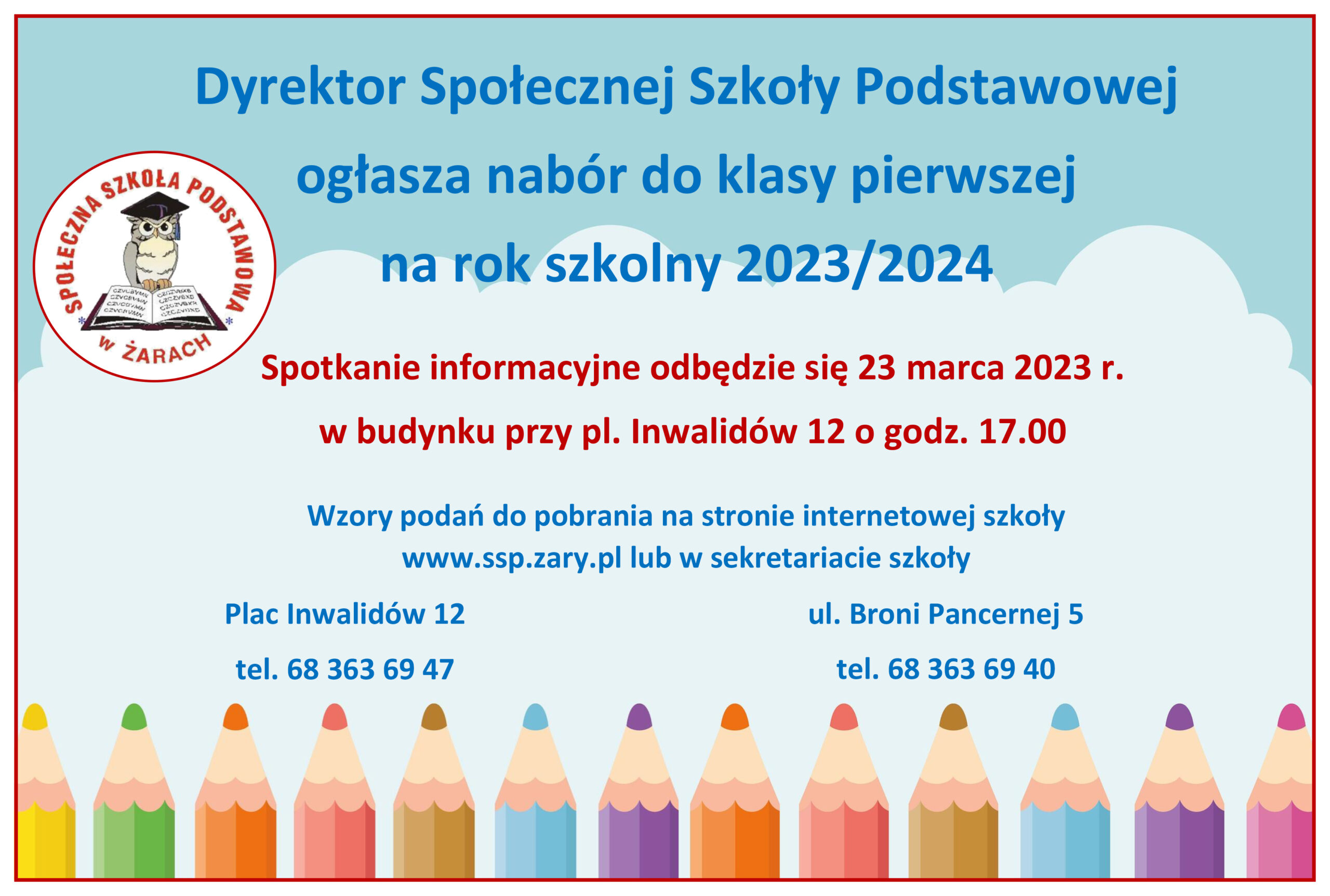 Dyrektor Społecznej Szkoły Podstawowej ogłasza nabór do klasy pierwszej na rok szkolny 2023/2024. Spotkanie informacyjne odbędzie się 23 marca 2023 r. w budynku przy pl. Inwalidów 12 o godz. 17.00. Wzory podań do pobrania na stronie internetowej szkoły www.ssp.zary.pl lub w sekretariacie szkoły